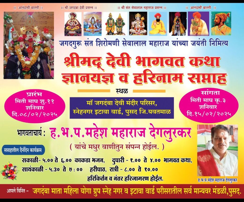 पुसद (प्रतिनिधी): जगद्गुरु संत शिरोमणी सेवालाल महाराज यांच्या जयंतीनिमित्त पुसद येथील इटावा वॉर्ड येथे माँ जगदंबा देवी मंदिर परिसरात दिनांक ८ फेब्रुवारी २०२५ ते १५ फेब्रुवारी २०२५ या कालावधीत श्रीमद देवी भागवत कथा ज्ञानयज्ञ व हरिनाम सप्ताहाचे आयोजन करण्यात आले आहे. ह.भ.प. महेश महाराज देगलुरकर यांच्या मधुर वाणीतून कथांचे रसपान होणार आहे.